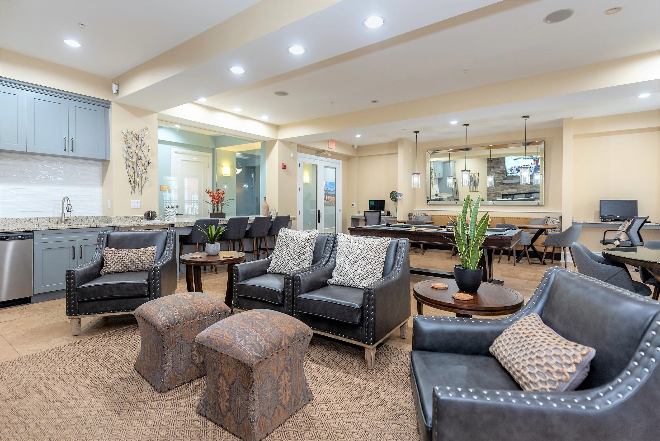 The resident social lounge offers a comfortable space to connect, featuring Wi-Fi, computer stations, and a billiard table—ideal for socializing, working remotely, or simply unwinding after a long day.